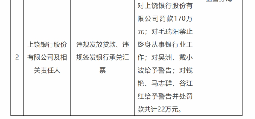 12月19日,国家金融监督管理总局上饶监管分局行政处罚信息公开表显示,上饶银行股份有限公司,违规发放贷款、违规签发银行承兑汇票,被罚款170万元;责任人毛瑞阳被禁止终身从事银行业工作;吴洲、戴小波被给予警告;钱艳、马志群、谷江红被给予警告并处罚款共计22万元。